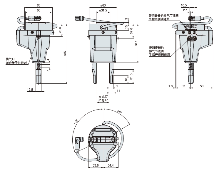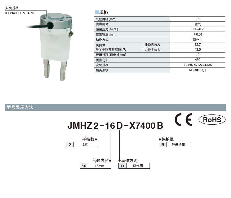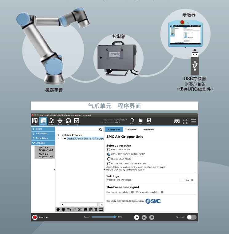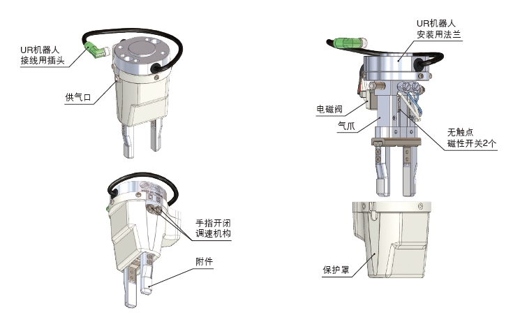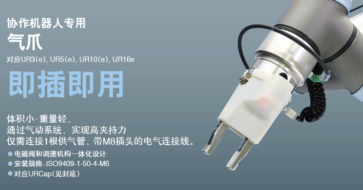 即插即用,對應URCap 編程簡易,采用空氣驅動,體積小重量輕,但夾持力大,僅需連接1根供氣管,帶M8插頭的電氣連接線,即可工作。,電磁閥和調速機構一體化設計安裝規(guī)格:ISO9409-1-50-4-M6